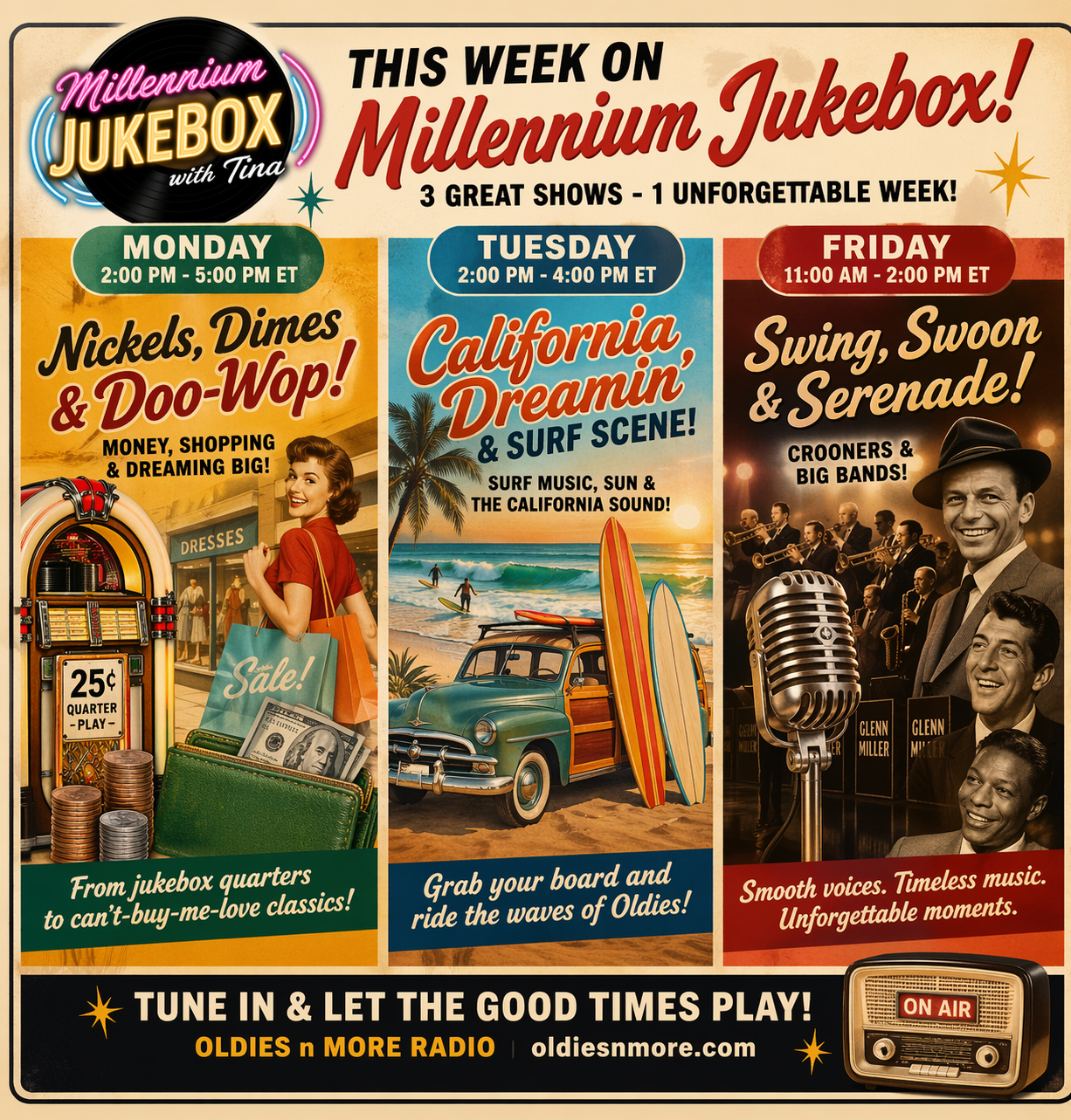 Friday, April 10th on Millennium Jukebox: “Nickles, Dimes and Doo-Wop” The best of the Oldies from 50’s 60’s and early 70’s at oldiesnmoreradio.com